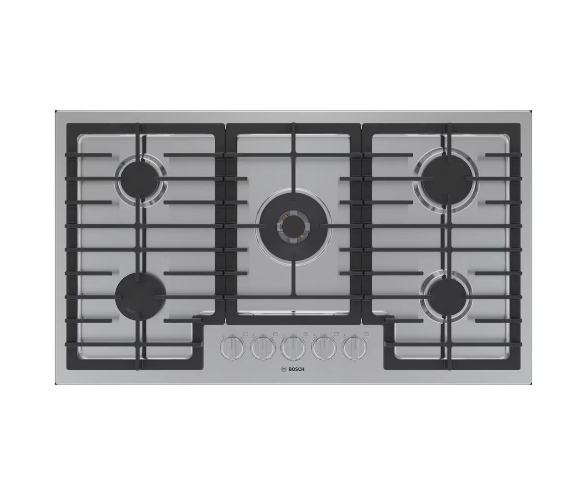Bosch 800 Series NGM8659UC 36 Inch Built-In Gas Cooktop with 5 Sealed Burners, FlameSelect®, LED Burner Indicator, OptiSim® Burner, Dual-Flame Power Burner, Continuous Cast-Iron Dishwasher-Safe Grates and ADA Compliant.