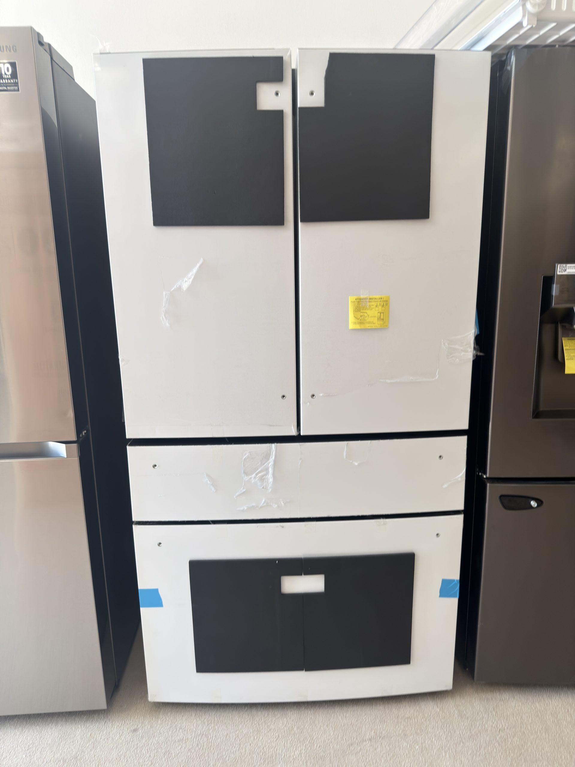 Cafe CGE29DP4TW2 36 Inch Freestanding 4-Door French Door Smart Refrigerator with 28.7 Cu. Ft. Total Capacity, Dual-Dispense AutoFill Pitcher, Convertible Drawer with Soft Freeze, Convertible Drawer with Glass Dividers, Built-In WiFi, TwinChill™ Dual Evaporators, Easy Clean, ENERGY STAR® and Sabbath Mode: Matte White with Brushed Bronze handles.