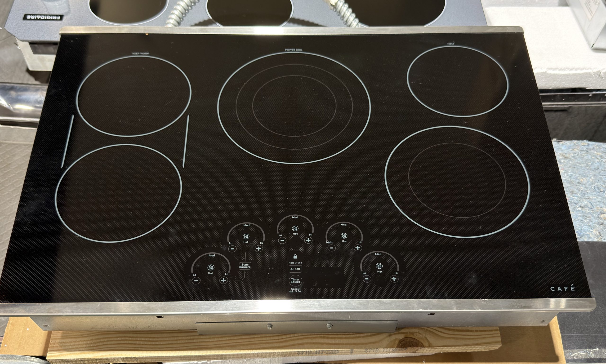 Cafe CEP90302NSS 30 Inch Built-In Touch Control Electric Cooktop with 5 Radiant Cooking Elements, Sync-Burners Capability, Power Boil, Glass Touch Controls, Keep Warm Setting, Melt Setting, Flexible Burner Sizes, Control Lock, Hot Surface Indicator, CafeÌ Fits Guarantee and ADA Compliant.