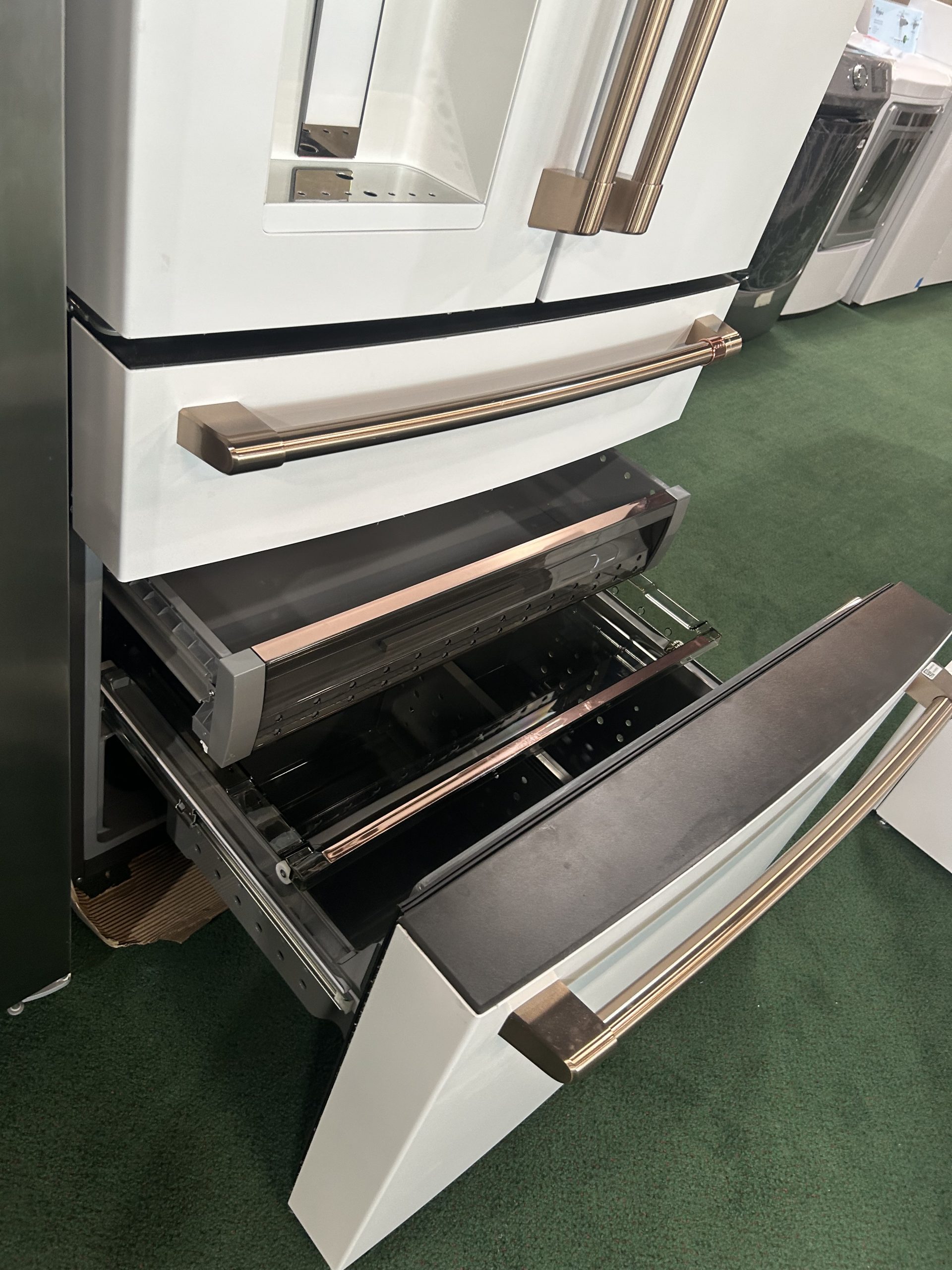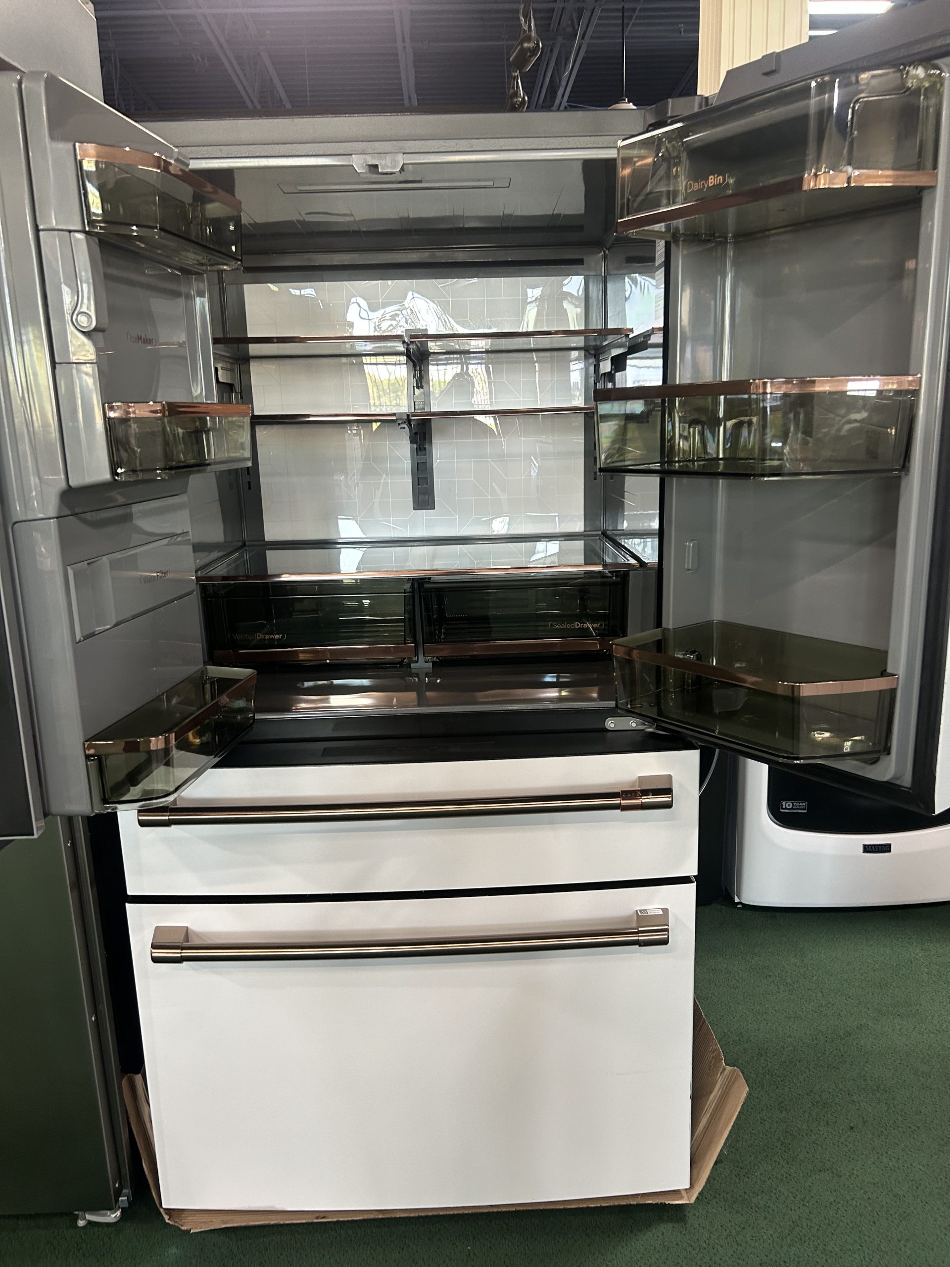 Cafe CVE28DP4NW2 36 Inch 4-Door French-Door Smart Refrigerator with 27.6 Cu. Ft. Capacity, TwinChill™, Convertible Drawer, LED Light Tower, Auto Fill, Humidity Control System, Enhanced Shabbos Mode Capable, and ENERGY STAR® Qualified: Matte White with Brushed Bronze Handles.