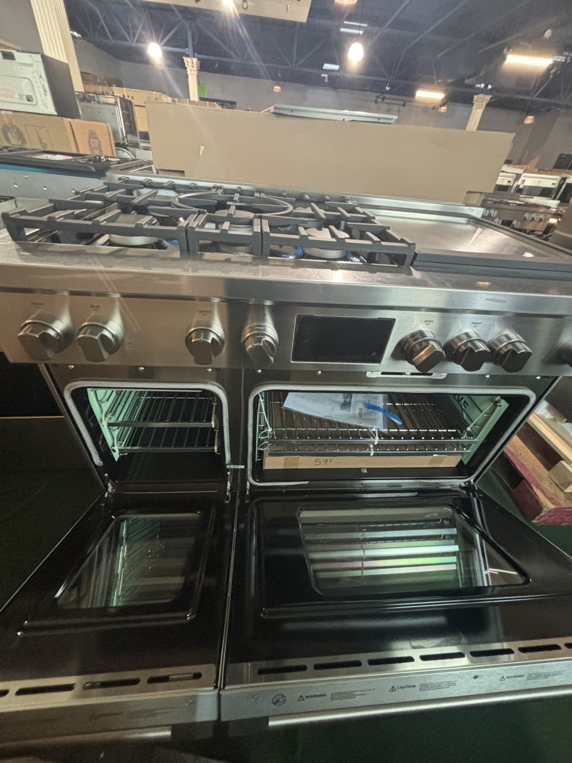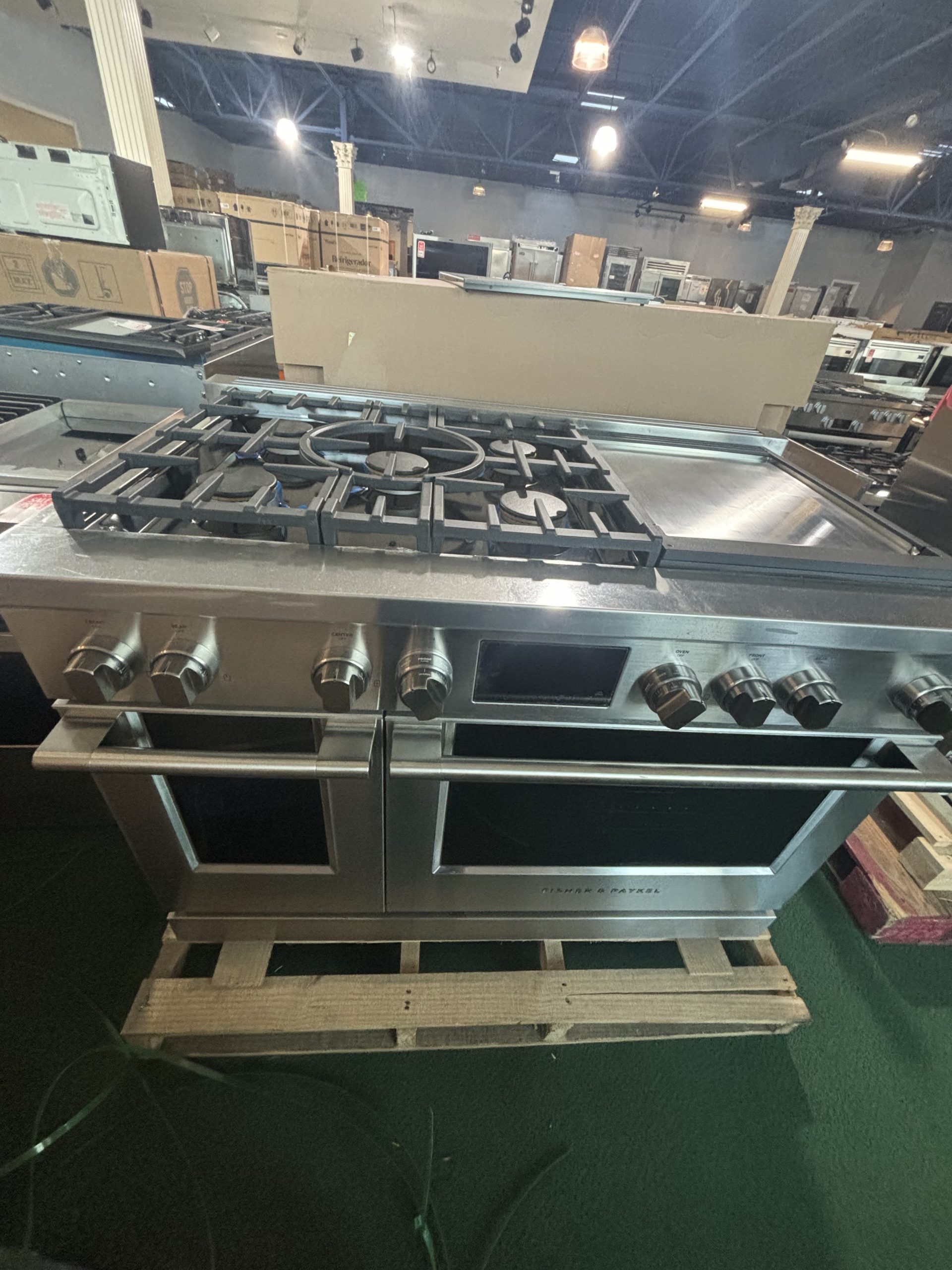 Prepare meals with this 48-inch Fisher & Paykel dual-fuel range. The continuous grate lets you slide pots and pans safely when cooking, while the five burners support multiple dishes at once. This Fisher & Paykel dual-fuel range comes with two spacious ovens that let you prepare large meals requiring different temperatures.