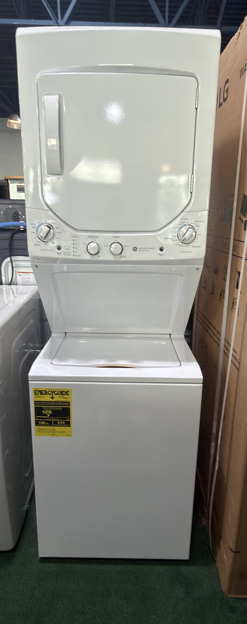 GE Spacemaker GUD24ESSMWW 24 Inch Electric Laundry Center with Auto-load Sensing, Cycle Status Light, Rotary Controls, 12 Wash Cycles, 6 Wash/Rinse Temperatures, and 830 RPM.