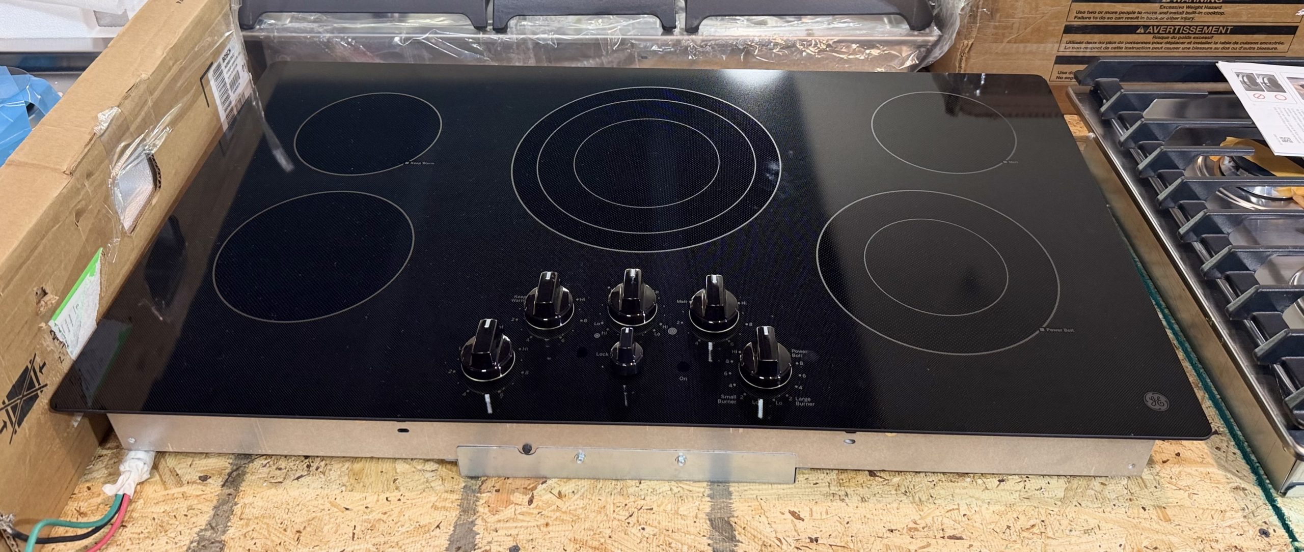 GE JEP5036DTBB 36 Inch Electric Cooktop with 5 Elements, Smooth Glass Surface, Dual/Tri Ring Element, Power Boil, Keep Warm, Melt Setting, Control Lock, Hot Surface Indicator, Knob Controls, Fit Guarantee, and ADA Compliant.