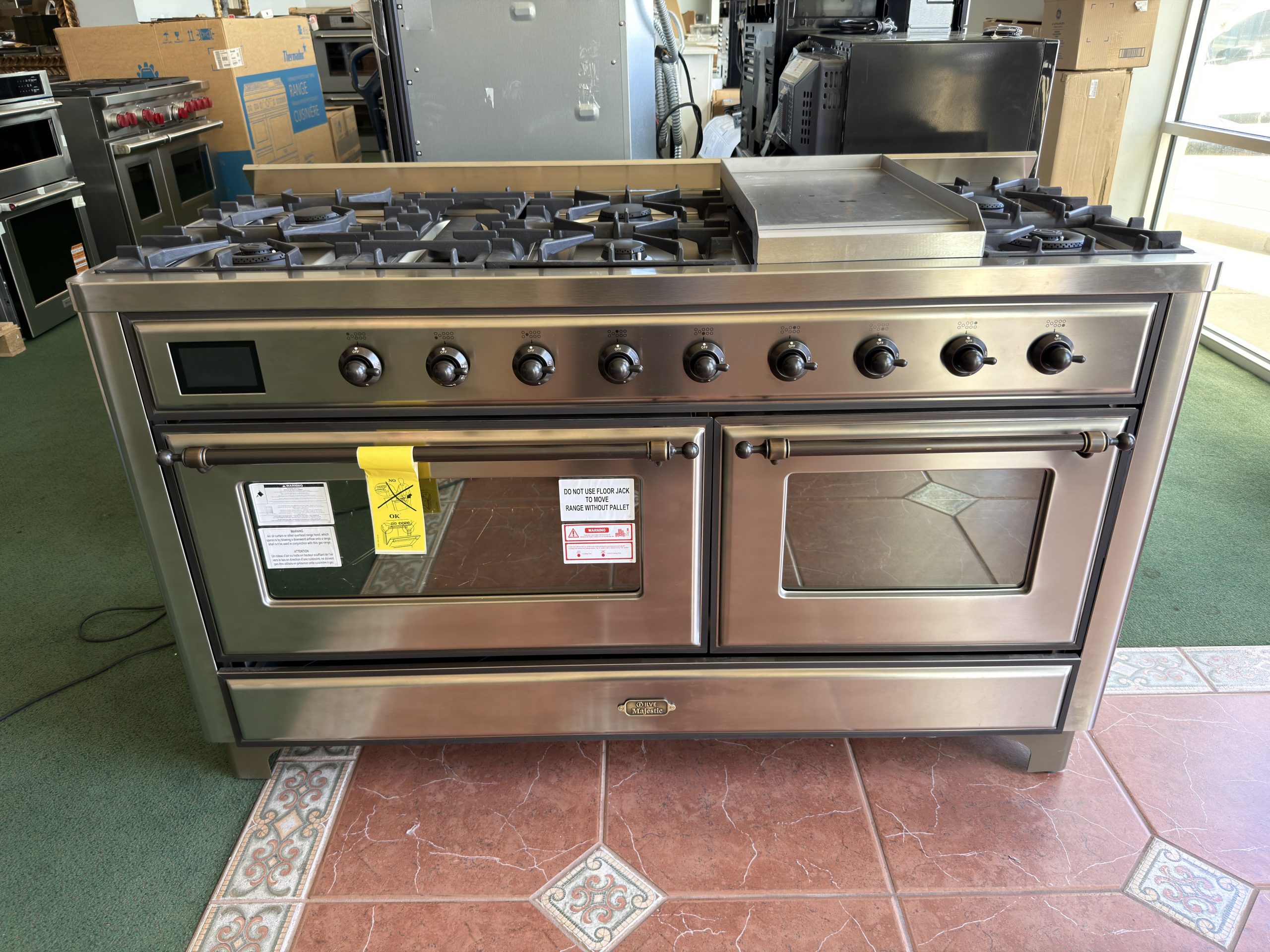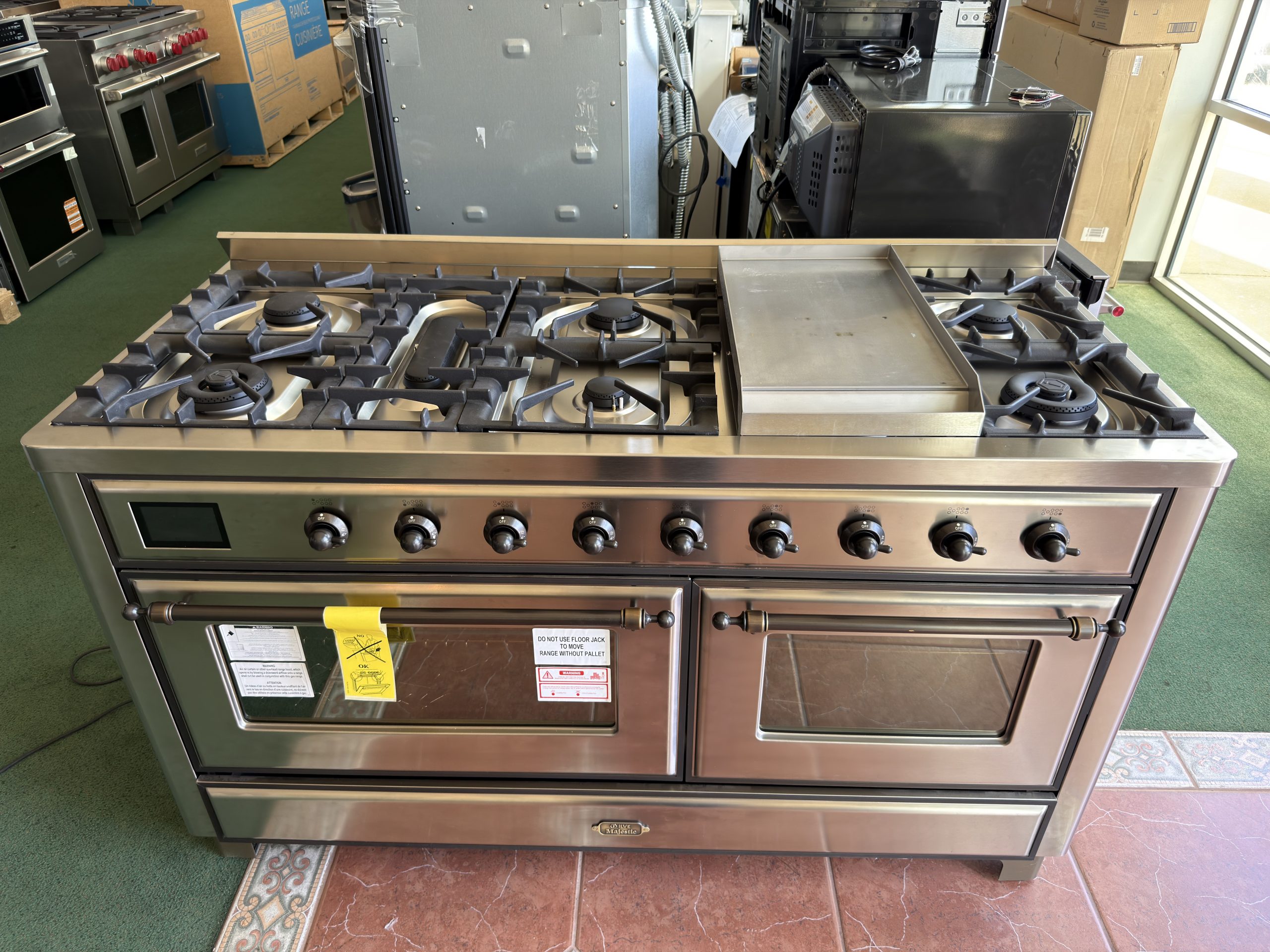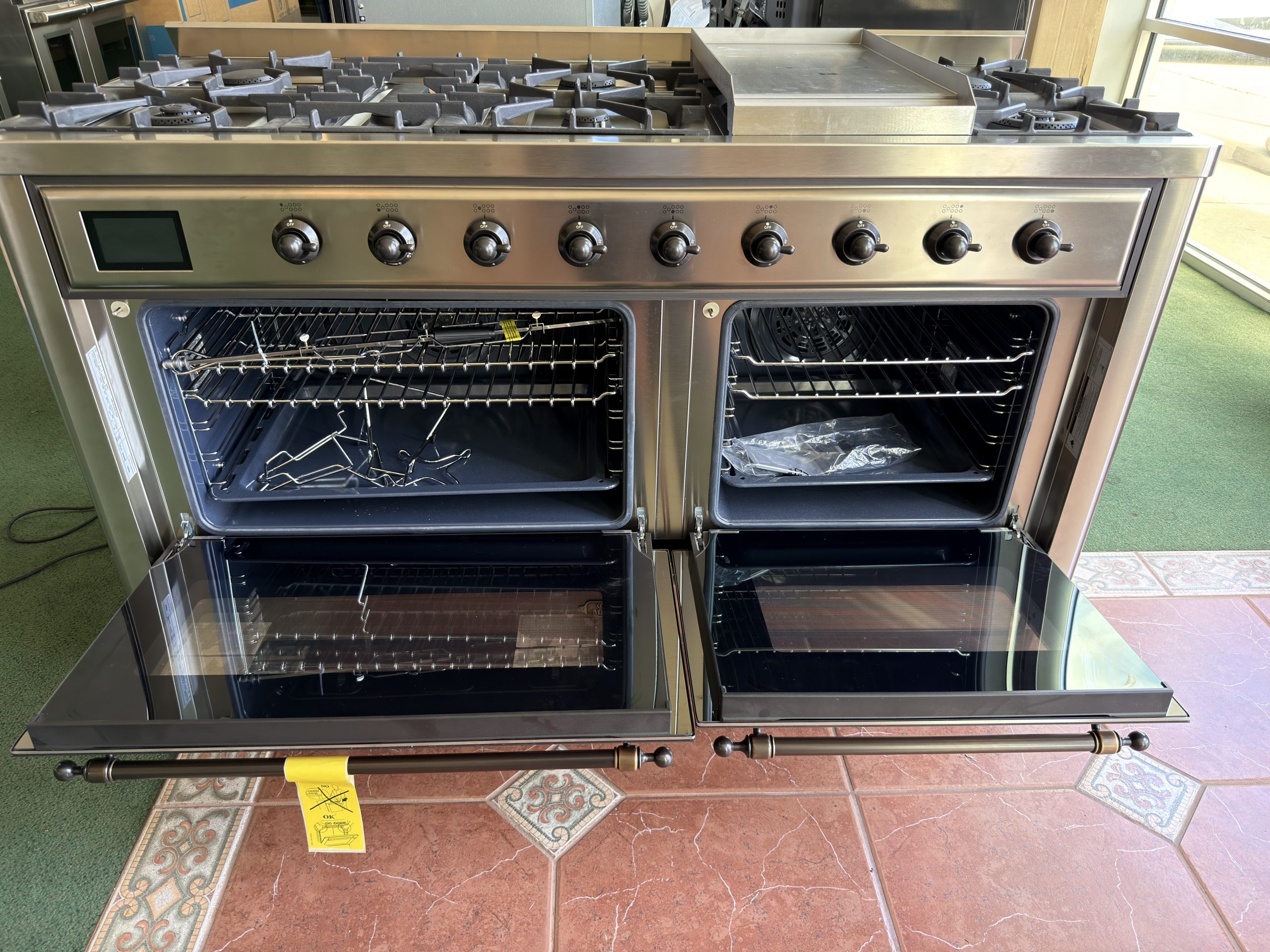 The Majestic 60″ dual-fuel range combines classic Italian style and cutting-edge technology. This range features 9 gas burners and a griddle, equipped with a total black-brass burner with a non-stick nanotechnological coating, and dual 3.5 + 2.3 cu. ft. total oven capacity, 4.3″ full-touch oven control display, and easy-clean enamel oven cavity.