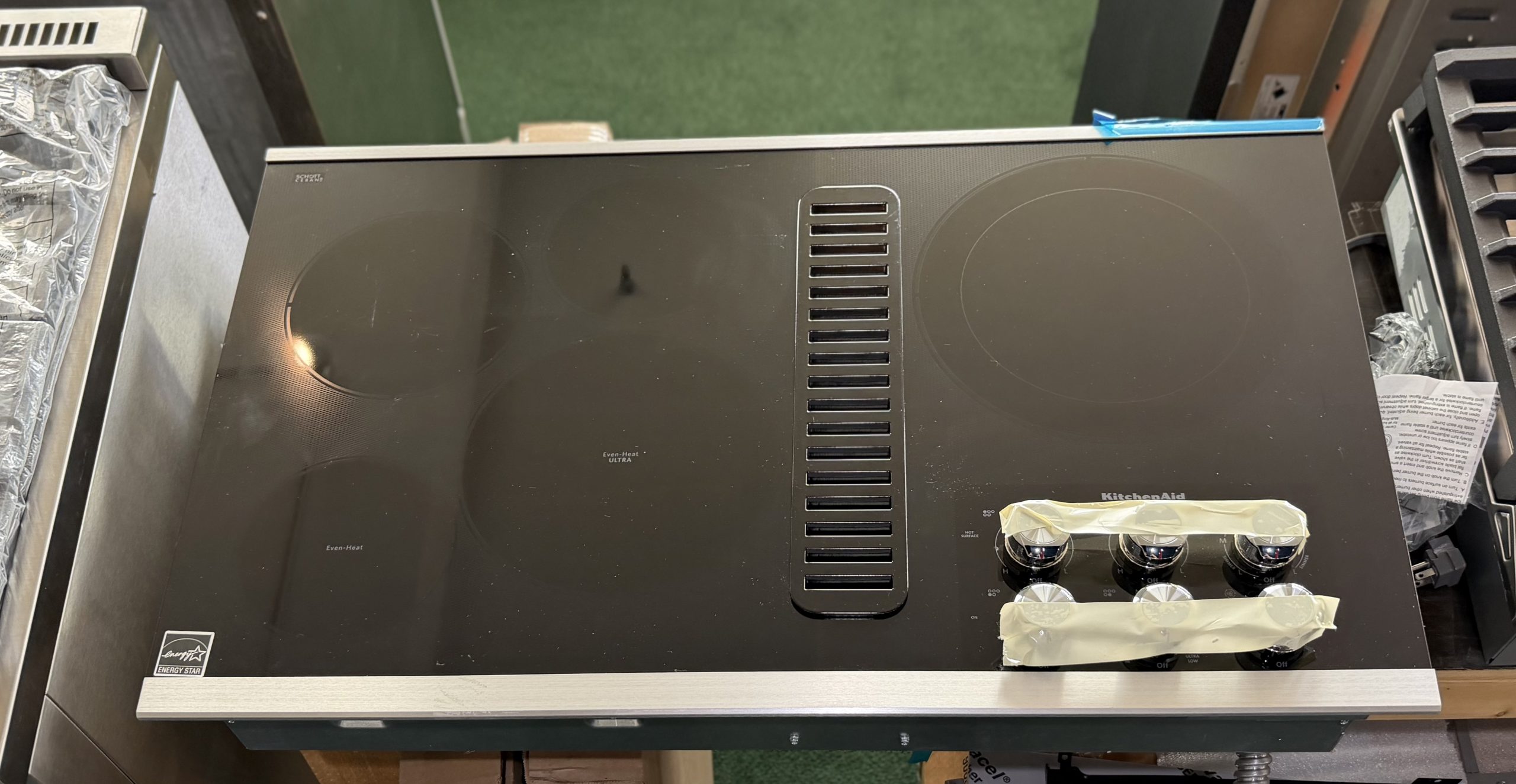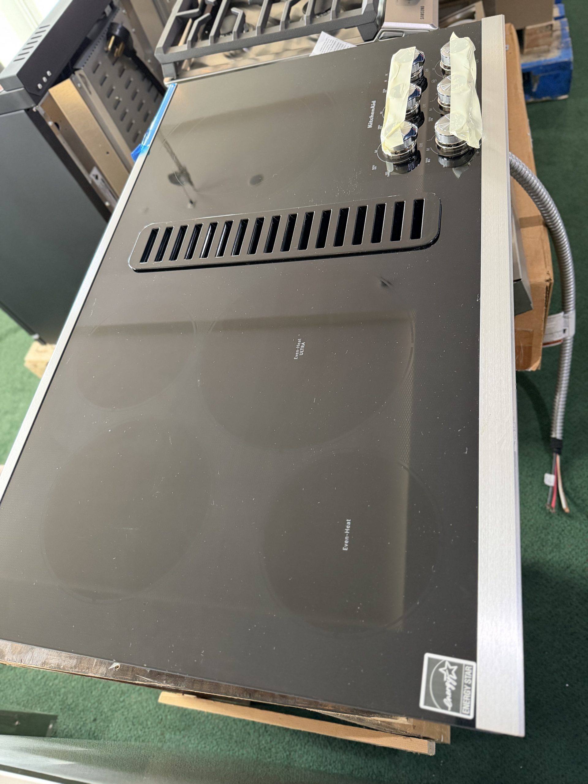 KitchenAid KCED606GSS 36 Inch Electric Downdraft Cooktop with 5 Elements, Ceramic-Glass Surface, Downdraft Ventilation, Even-Heat Ultra Element, 300 CFM Exhaust, 3-Speed Fan Control, CookShield Finish, Double-Ring Element, Hot-Surface Indicator, UL Listed and ENERGY STAR Certified: Stainless Steel.