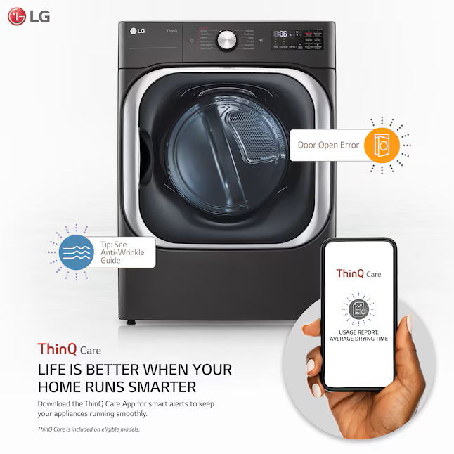 LG TurboSteam Series DLEX8900B 29 Inch Smart Electric Dryer with 9.0 Cu.Ft. Capacity, 12 Dryer Programs, 12 Dryer Options, Dial-A-Cycle™, Sensor Dry, TurboSteam™, SteamSanitary™, and Energy Star Certified.