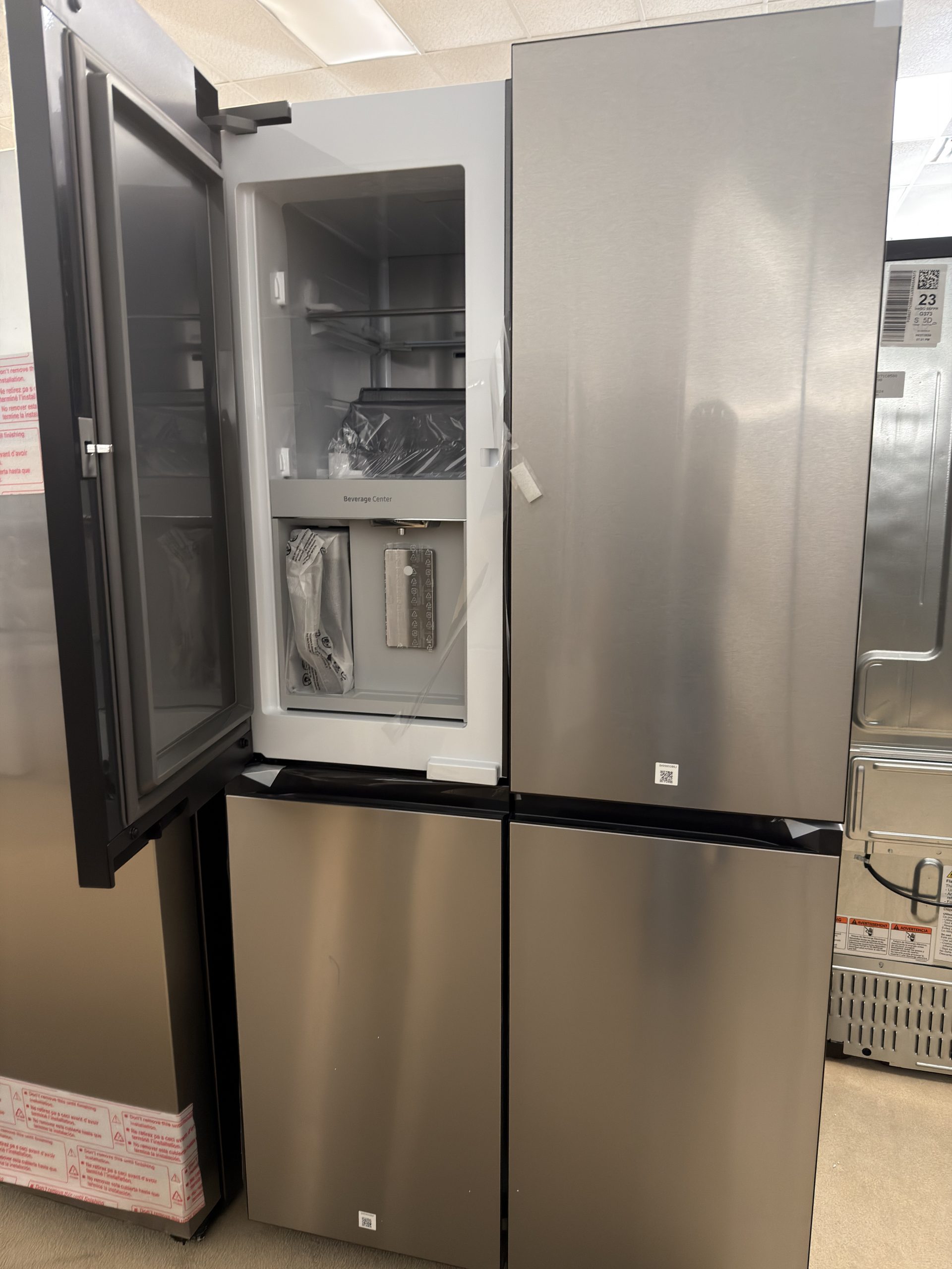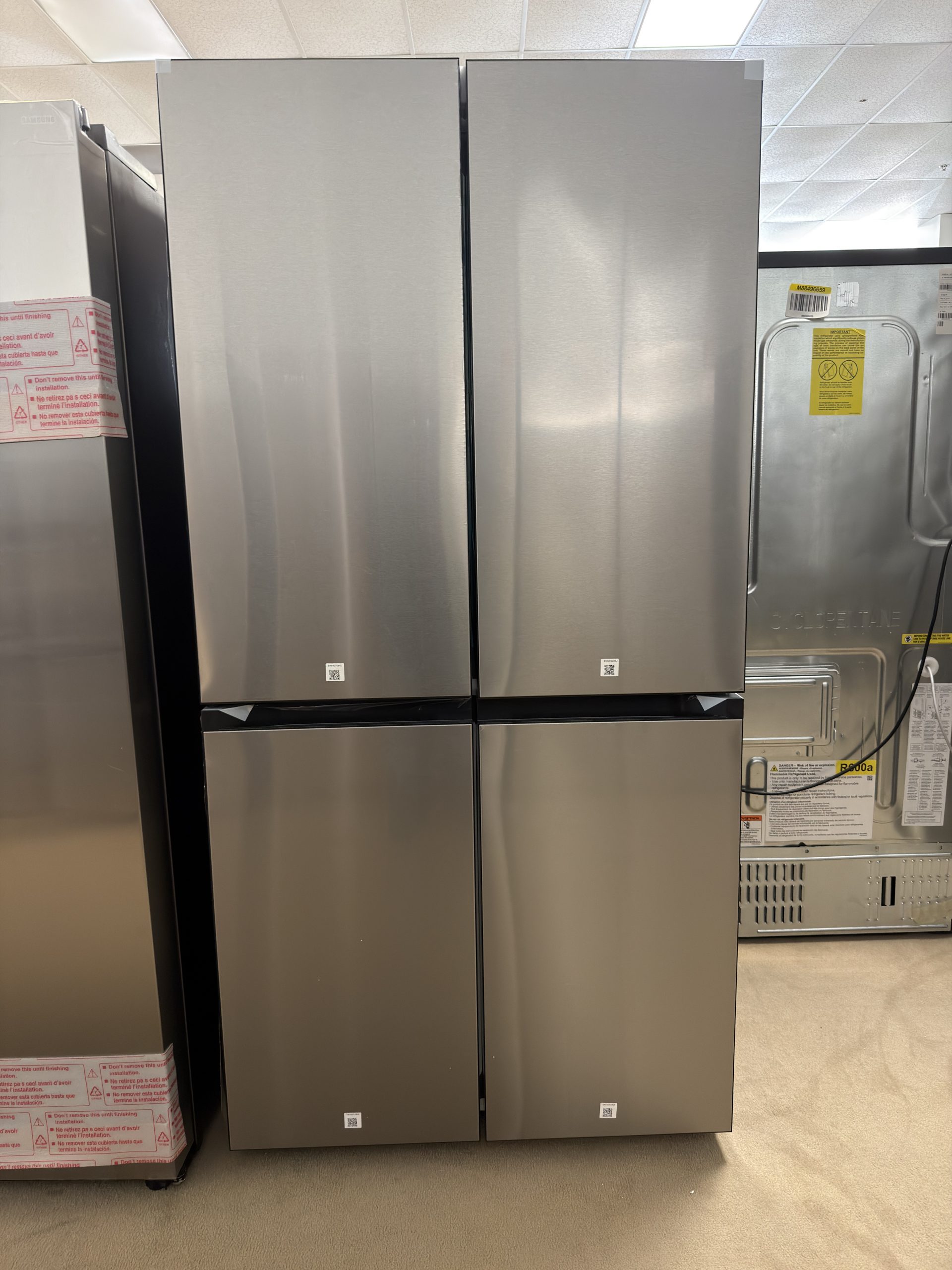 Samsung BESPOKE RF23DB9600QL 36 Inch Smart Counter-Depth 4-Door Flex™ French Door Refrigerator with 23 cu. ft. Capacity, FlexZone™, Beverage Center™, UV Deodorizing Filter, Wi-Fi Enabled, Dual Ice Maker, Door Alarm, Auto Open Door, Slide-In Shelf, and ENERGY STAR®: Fingerprint Resistant Stainless Steel.