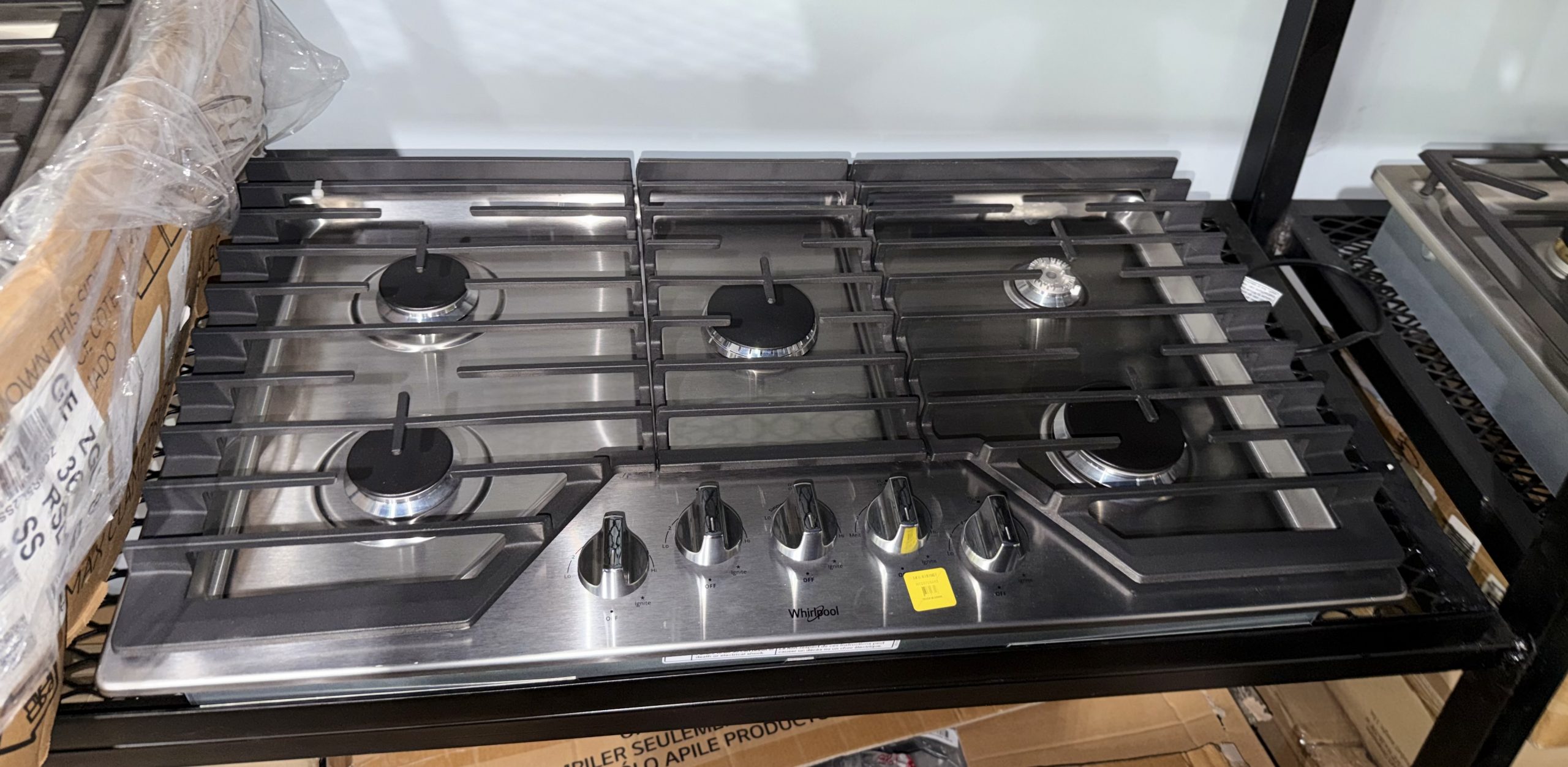 Whirlpool WCG97US6HS 36 Inch Gas Cooktop with 5 Sealed Burners, EZ-2-Lift™ Hinged Grates, SpeedHeat™ Burner, AccuSimmer® Burner, Upswept SpillGuard™ Cooktop, Griddle, and Dishwasher-Safe Knobs.