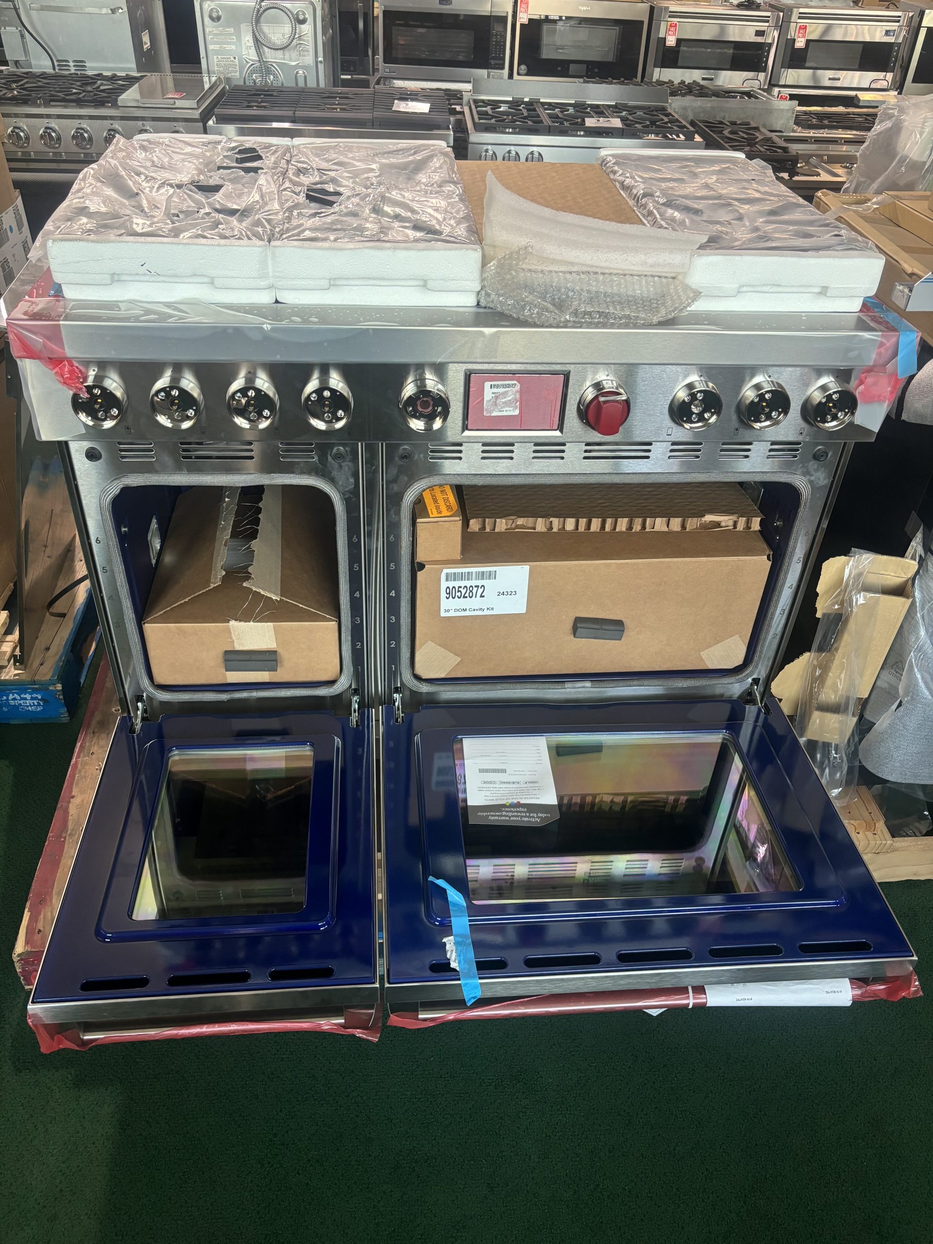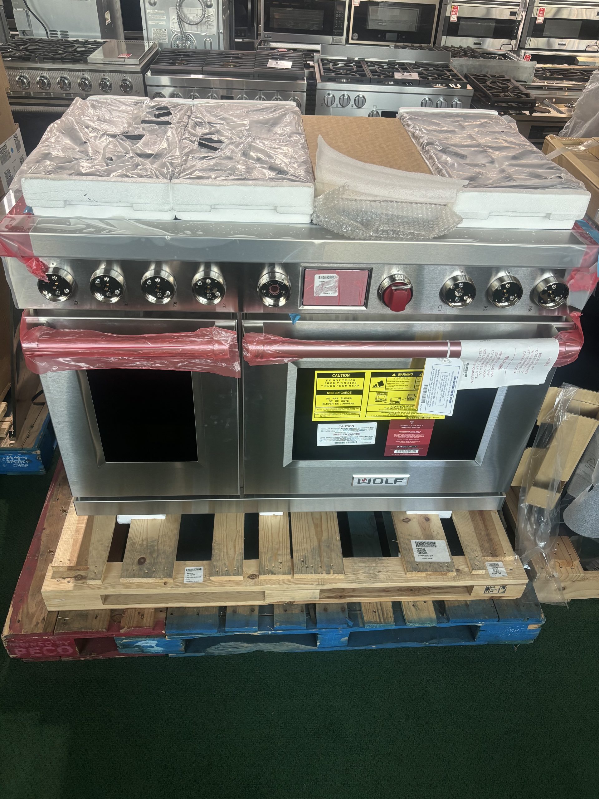 Wolf M Series DF48650GSP 48 Inch Freestanding Dual-Fuel Smart Range with 6 Dual Stacked Sealed Burners, Double Oven, 7.8 cu. ft. Total Oven Capacity, Continuous Grates, Infrared Griddle, Self-Clean, Gourmet Mode, Touch Screen Controls, 10 Cooking Modes, Halo Lights, Temperature Probe, Sabbath Mode and STAR-K Certified: Stainless Steel – Natural Gas